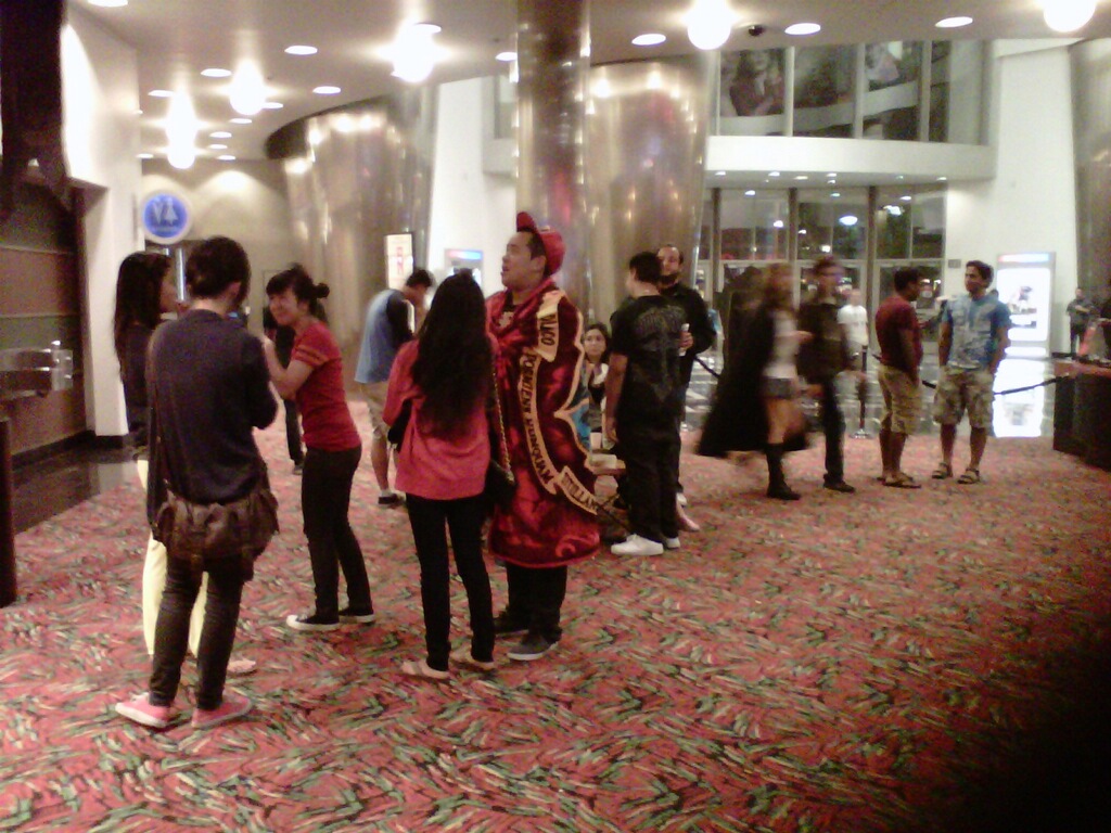 Arribé a los cines del “Block” en Orange, CA, en donde había comprado mi boleto en la pre-venta para la función de la media noche. Mientras me acercaba al teatro, noté que había cuatro diferentes filas. Posteriormente, recogí mi boleto y fue escoltada al interior del cine ya que había comprado el boleto para la función en tercera dimensión (3D). Llegué temprano y cuando ingresé a la sala parecía que había una gran fiesta en pleno apogeo. Las personas estaban jugando con pelotas de playa y estaba muy ocupados discutiendo las posibles escenas o desenlaces. El reloj marcó la media noche y la función inició con un gran aplauso y mucha emoción por parte de los asistentes.