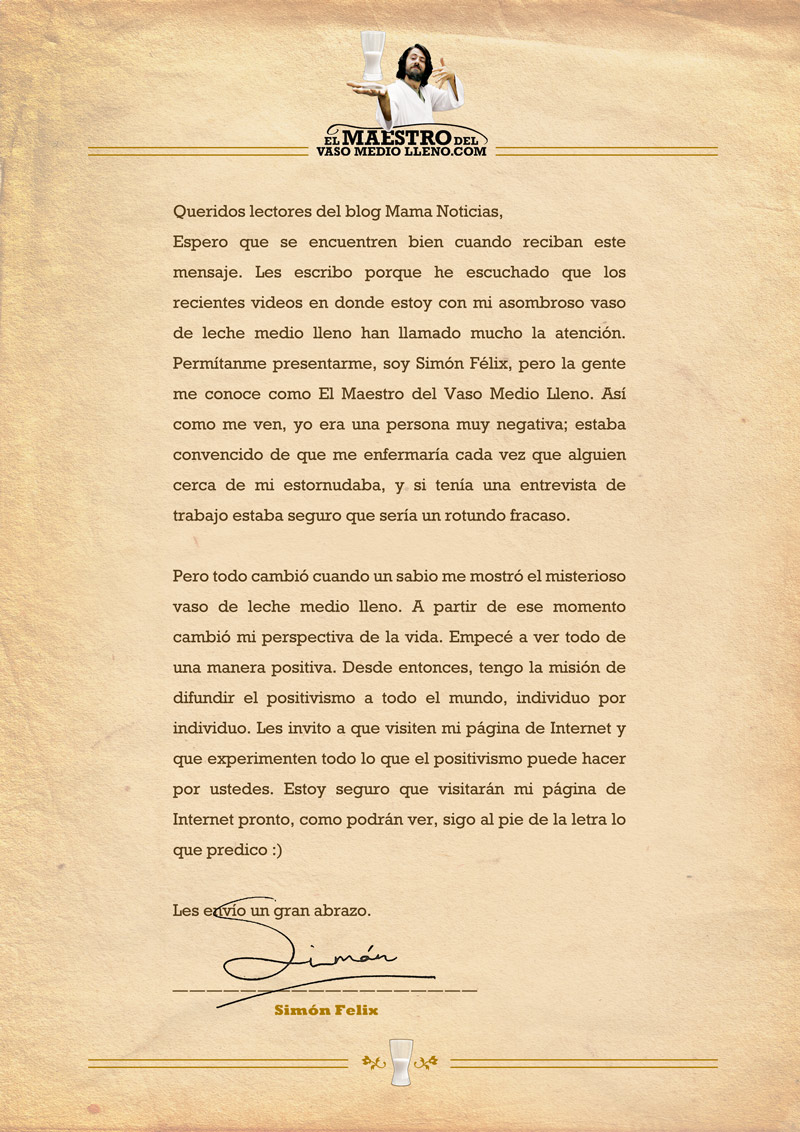 Hoy, “El Maestro del Vaso Medio Lleno”, nos ha pedido compartir con ustedes una carta dedicada especialmente a todos los lectores de Mamá Noticias. A continuación podrán ver el mensaje que les envía.