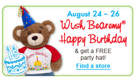 Por cierto en tu próxima visita del 24 al 26 de agosto a Build-A-Bear Workshop te recomendamos desearle feliz Cumpleaños y recibirás un sombrero alusivo. Para mayor información consulta en tu tienda mas cercana o en Happy Birthday Bearemy