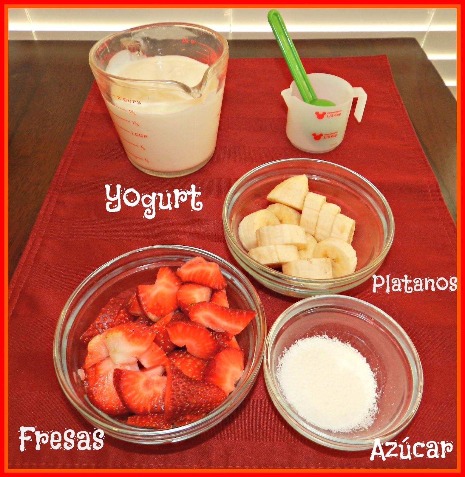 Para su elaboración, utilizamos la licuadora y con la ayuda de mi hijo integramos cada uno de los ingredientes, primero las fresas, luego el plátano, el azúcar y al final el yogurt.