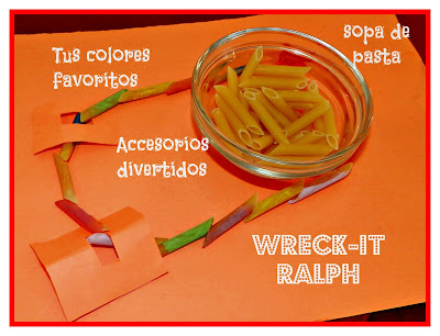 Como seguramente ya han inferido, Wreck-it Ralph fue la cinta favorita de mi hijo del 2012. Y ahora que ha salió a la venta, mi hijo decidió darle el toque final para darle la bienvenida a su amigo Wreck-It Ralph haciendo un collar para que pudiéramos lucir, tanto el como yo. Así que manos a la obra, busco en la cocina sopa de pasta, sus colores favoritos e hilo para realizar esta actividad.